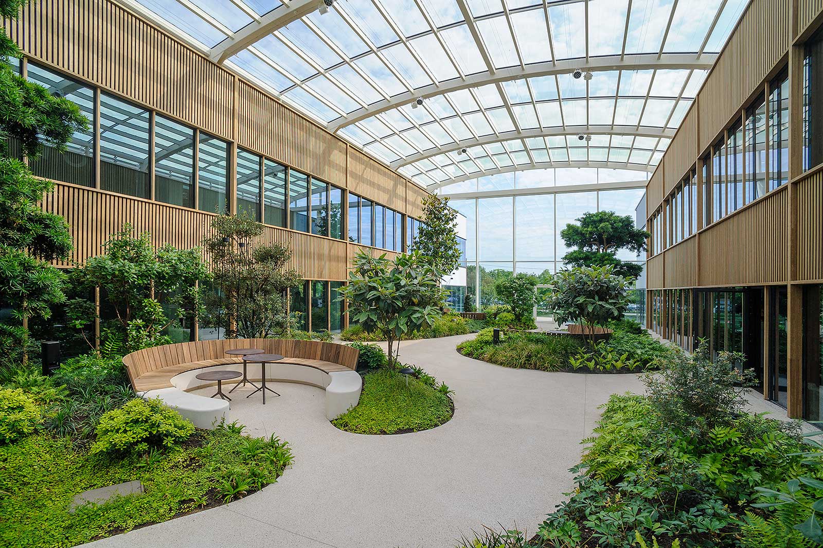 Een bioklimatisch glasdak opgebouwd uit boogspanten