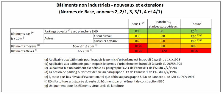 Pour les bâtiments industriels, la classification se fait en fonction de la charge d'incendie attendue d'une part, et de l'importance de l'élément structurel en cas d'effondrement (par le feu) d'autre part. Ceci est expliqué plus en détail dans la rubrique Bâtiments industriels (Belgique).