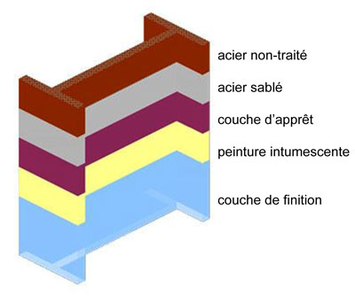 Afin de donner à la structure la résistance au feu désirée et de laisser malgré tout l’acier apparent, on a souvent recours à l’application d’une couche de peinture intumescente. La peinture gonfle lorsqu’elle est chauffée et forme une couche isolante qui ralentit le réchauffement de l’acier.