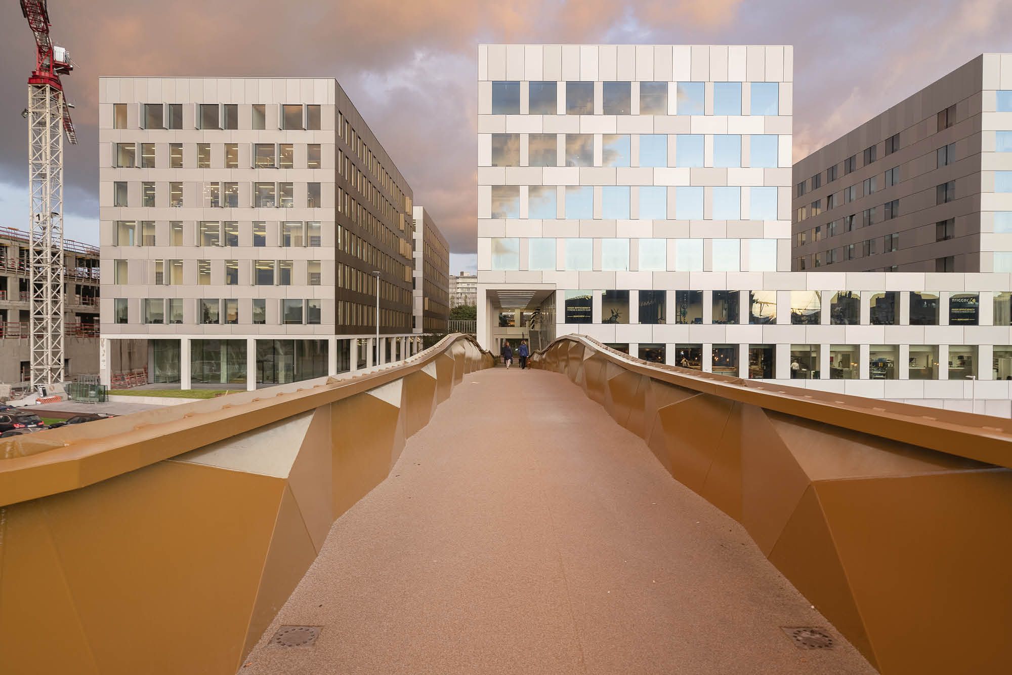 La passerelle piétonnière fait partie du nouveau complexe de bureaux de Post X. Elle relie la place intérieure du projet à la place de la gare de Berchem. Elle passe d’abord par la colonnade du centre de services – dont elle constitue simultanément l’entrée principale – pour ensuite enjamber le boulevard périphérique du Singel. Un pilier de soutènement en béton architectural a été installé à côté de la piste cyclable. Sur la place, le pont se transforme en un large escalier avec ascenseur annexe. La passerelle piétonnière de Post X fait au total 111 m de long et la travée la plus longue enjambe le boulevard périphérique intérieur sur 44 m. La largeur utile de la passerelle est de 3 m.