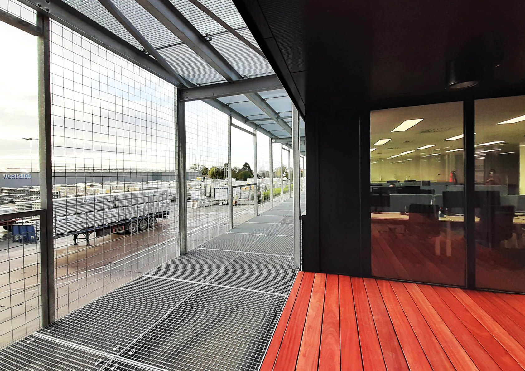 L’étage supérieur est constitué de plateformes en mezzanine, revêtues de dalles de moquette. Le toit est composé d’un steeldeck et d’une isolation en laine de roche. La façade sud est revêtue de panneaux sandwichs. Ceux-ci sont fixés à des profilés horizontaux et laminés à froid, auxquels la charpente est fixée. Une structure extérieure végétalisée a été placée devant la façade. Transparente et galvanisée, cette structure est composée de profilés légers et de grilles de plancher, tout comme les escaliers de secours. Des plantes grimpantes se répandront progressivement sur l’ensemble de la façade grâce à des armatures galvanisées pourvues de larges ouvertures.