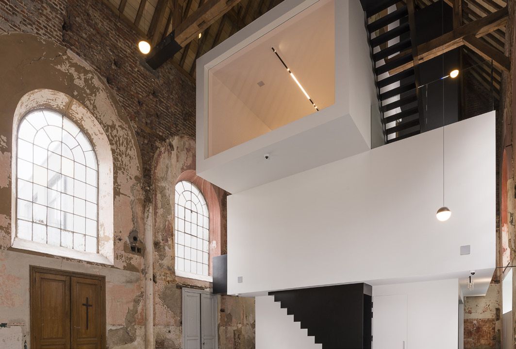 Klaararchitectuur a transformé une chapelle du 16ème siècle en une nouvelle base d’opérations. Quatre volumes rigides, empilés l’un sur l’autre, assurent un beau contraste. L’empilage est chevauchant, ce qui fait que les volumes sont en porte-à-faux l’un par rapport à l’autre. La nouvelle structure en acier, constituée de poutres HEB, est indépendante du bâtiment existant. Les sols ont été réalisés à partir de profils Z en acier de 140 mm de haut pour soutenir une finition de sol en bois. Les escaliers sont en tôles d’acier découpées au laser. L’ancienne toiture en chêne a été renforcée par des éléments en acier.