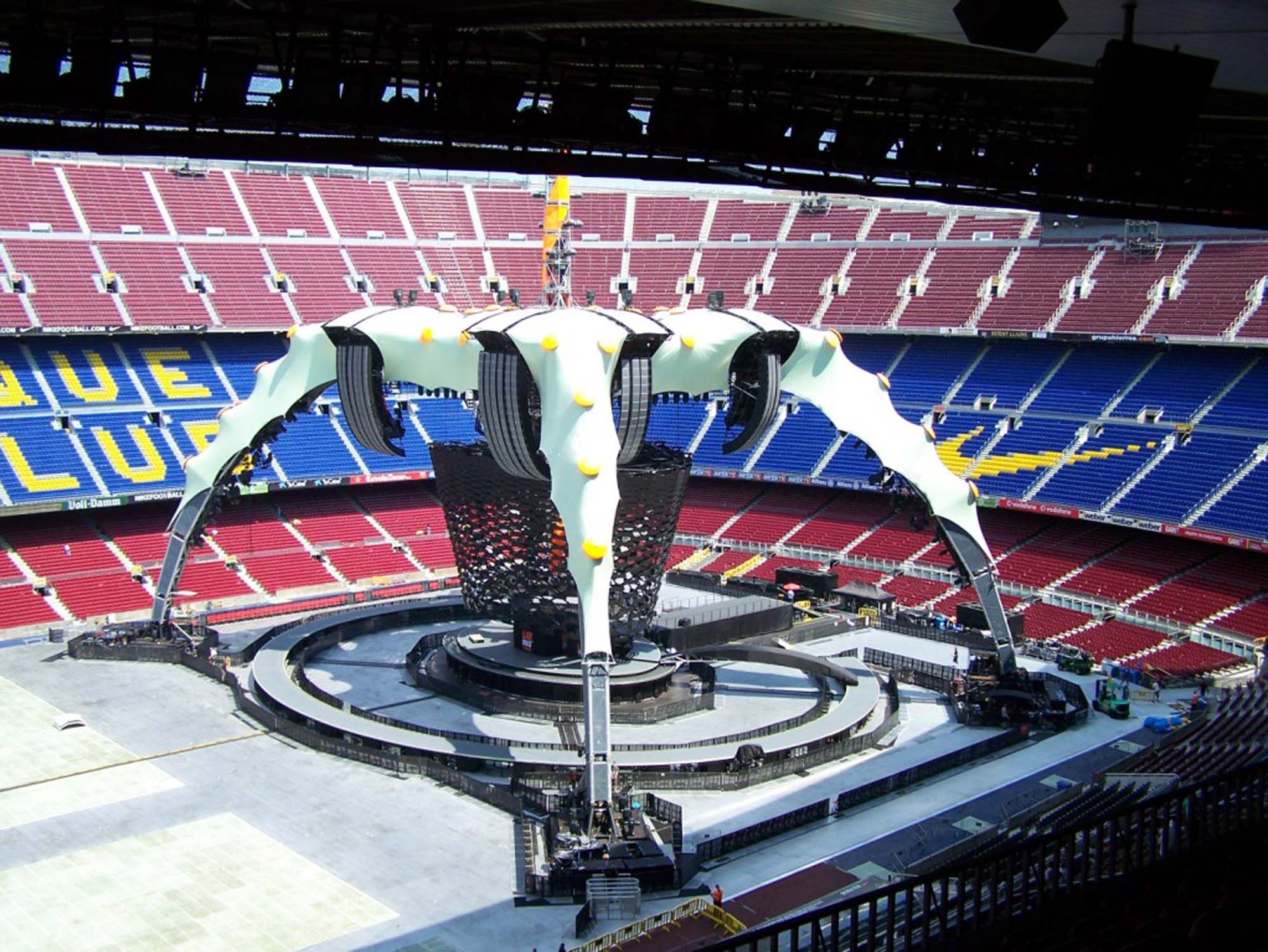 Pour une série de 79 concerts à travers le monde, le groupe de rock irlandais U2 a commandé ‘The Claw’ (la Griffe), une structure en acier de 28 m de haut avec une pointe centrale atteignant 51 m. La construction repose sur quatre piliers courbes abritant l’appareillage son et lumière. La structure franchit 60 m sans gêner la vue du public. La structure en acier de 250 tonnes se monte en quatre jours et se démonte en deux jours. Chaque pilier courbe est constitué de 13 segments treillis trapézoïdaux, munis de crochets à souder. Les segments sont constitués de tubes à paroi épaisse formés à chaud. Toutes les découpes des tubes ont été faites à l’aide de machines CNC et soudées à l’aide de gabarits spécifiques. Grâce à une réalisation scrupuleusement identique, les segments sont interchangeables, ce qui simplifie l’installation.