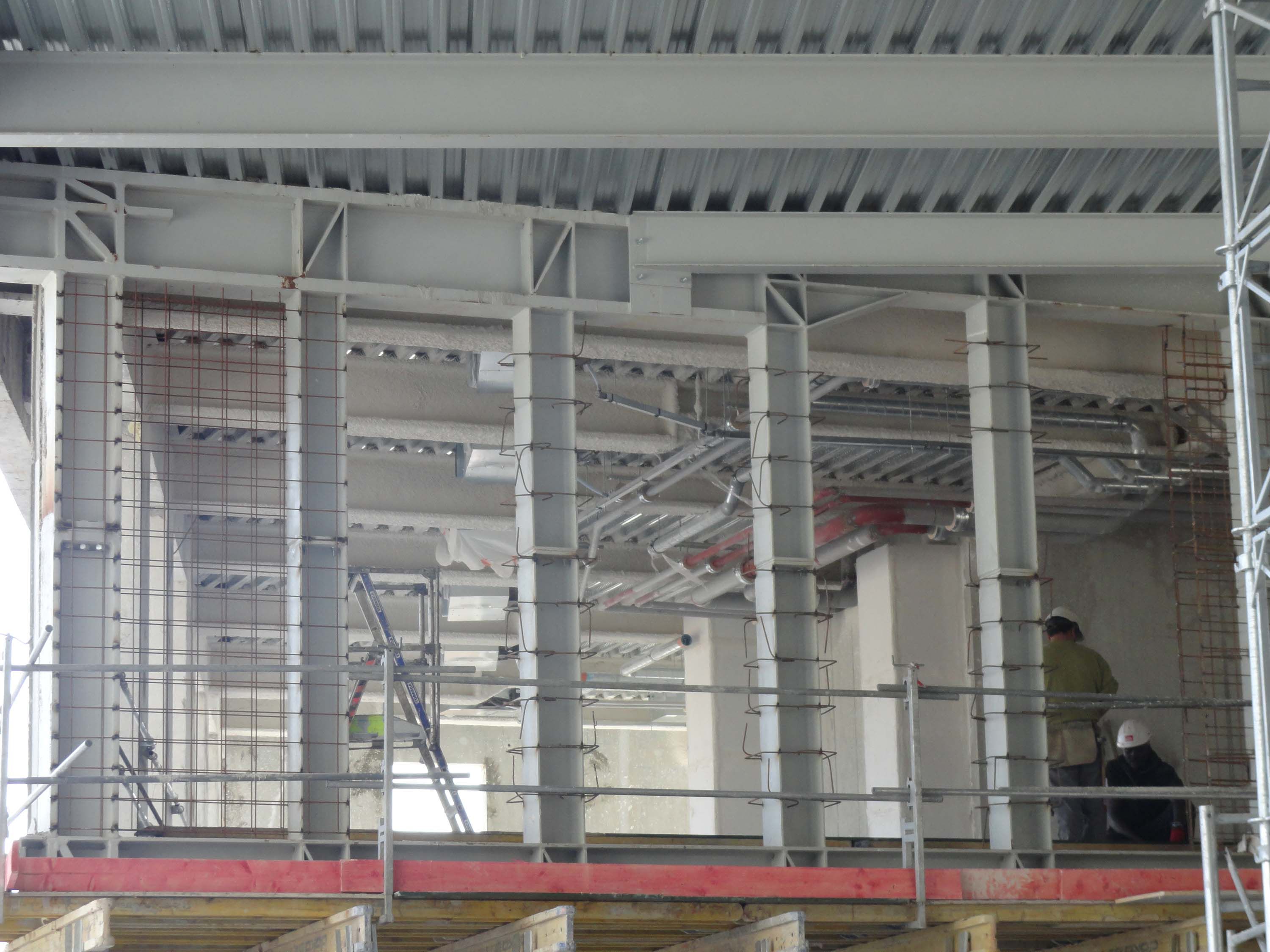 De stalen liggers werden met RF behandeld door middel van een flocage. De staalplaatbetonvloer werd zo berekend dat hij met een extra-bijlegwapening ook een brandweerstand verkrijgt.