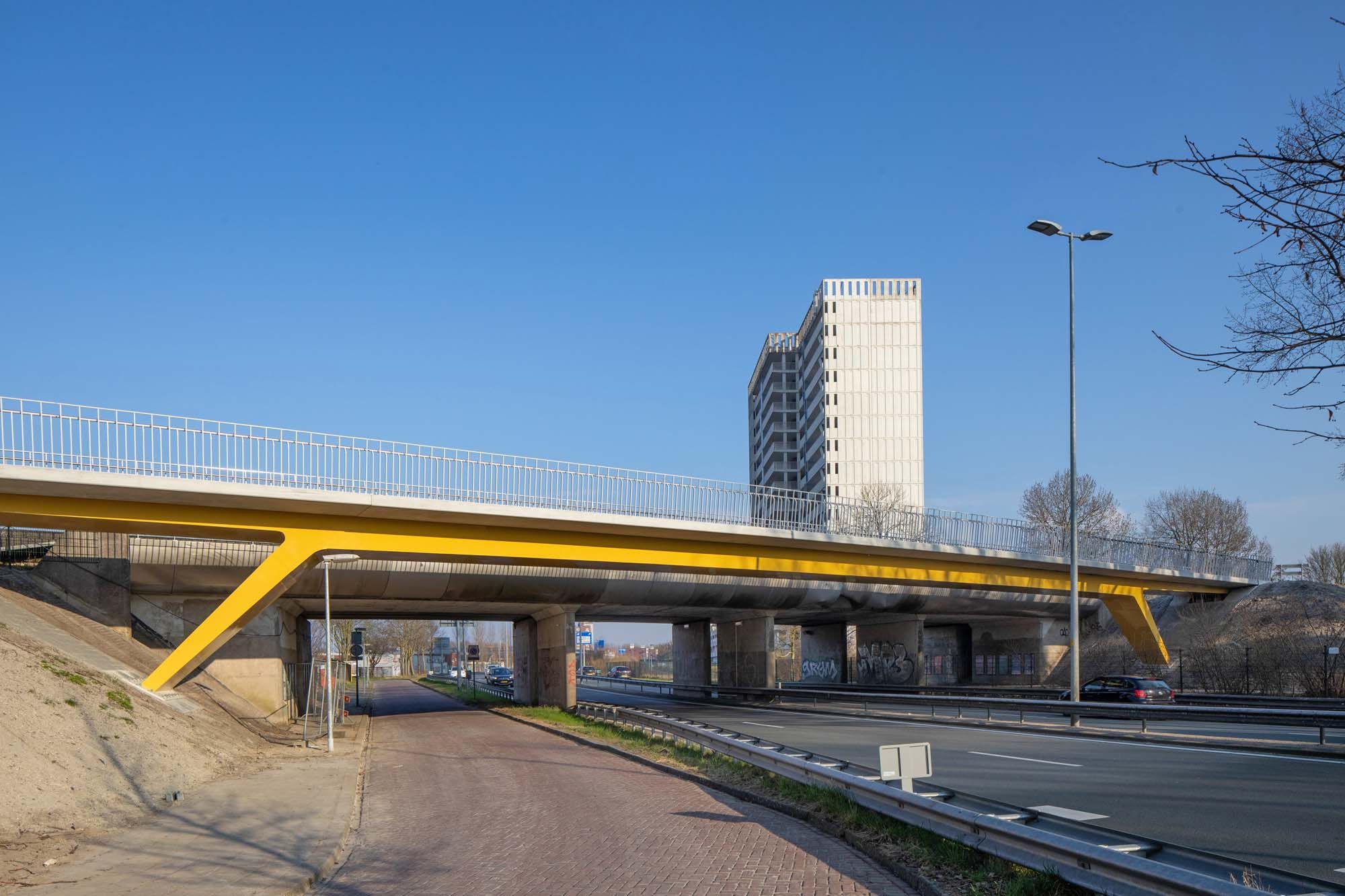 Un pont élancé et discret qui fait subtilement référence au 'hoogholtje de Groningue' (pont piétonnier surélevé qui laisse passer les bateaux). Voici le nouveau pont cyclable de 56 m de long qui enjambe la Plataanlaan à Groningue. La municipalité souhaitait un pont plat qui ressemble à la planche archétypale au-dessus de l'eau. Pour que cela soit possible, tout en conservant un passage libre sans point d'appui sur la route provinciale en contrebas, le choix s'est porté sur une construction dite 'à béquilles'. Les points d'appui sont inclinés et forment un ensemble triangulaire avec les culées. Grâce à l'effet de voûte des points d'appui inclinés, le tablier est élancé malgré la grande portée. Toutes les parties du pont sont reliées entre elles de manière particulièrement solide : les concepteurs ont opté pour un pont en acier et béton, dans lequel l'acier et le béton fonctionnent ensemble d'une manière extrêmement efficace. Un caisson en acier constitue la structure porteuse principale, sur laquelle repose un tablier en béton. Ce dernier est relié au caisson en acier à l'aide de goujons. Le pont en acier et béton combine ainsi le meilleur des deux mondes : un pont élancé et rapide à construire à un prix attractif. La balustrade à bandes est sobre et transparente, de sorte que la ligne horizontale continue du pont est particulièrement mise en valeur. La balustrade est toutefois également très raffinée, notamment grâce à sa conception multicouche. Elle se compose de deux bandes différentes.