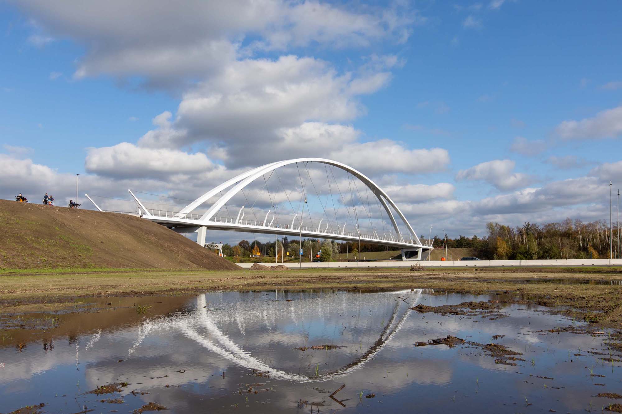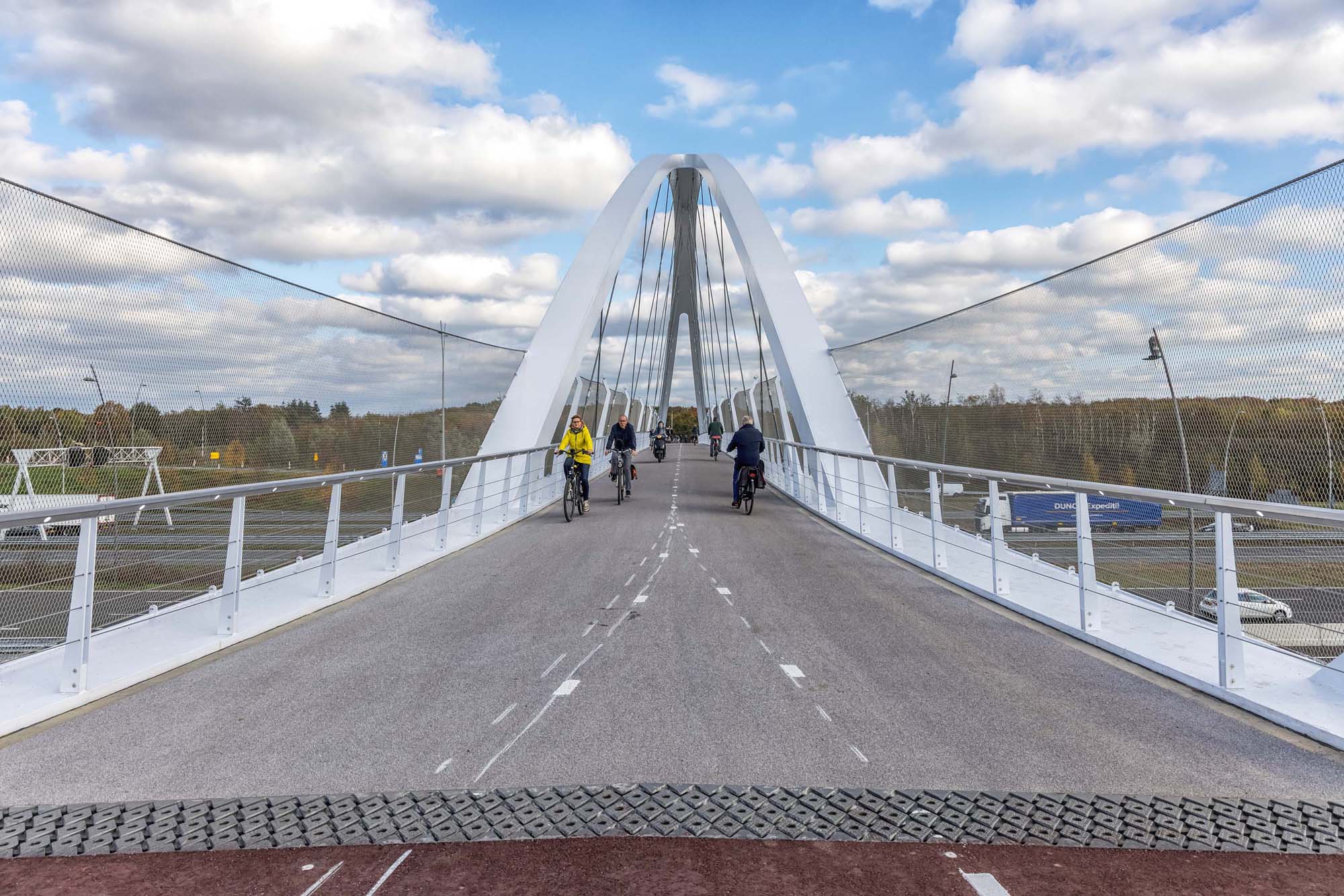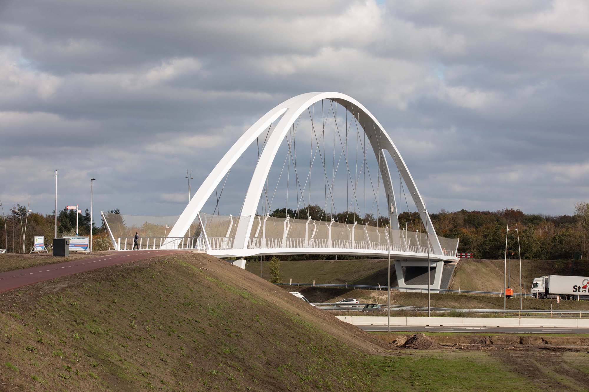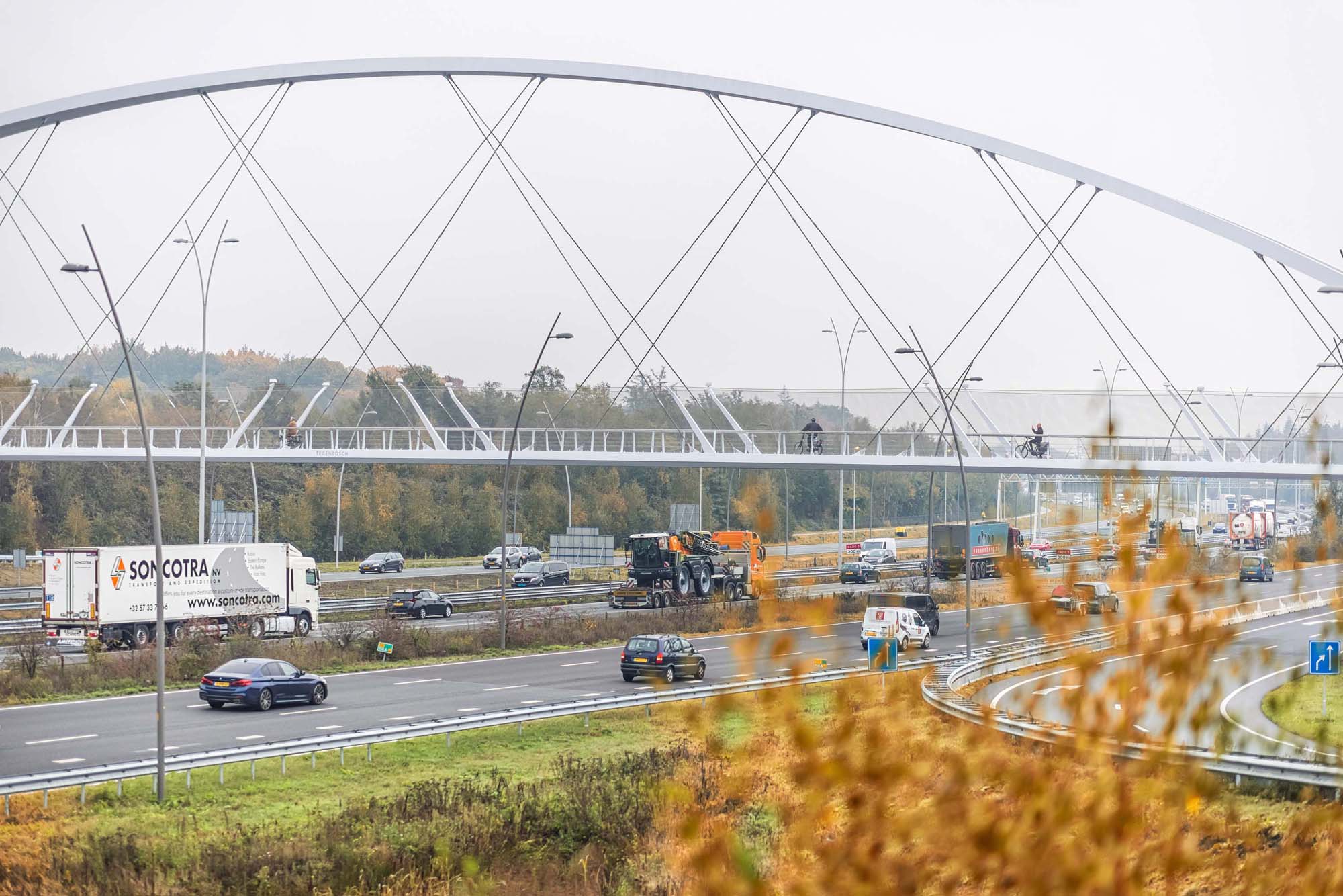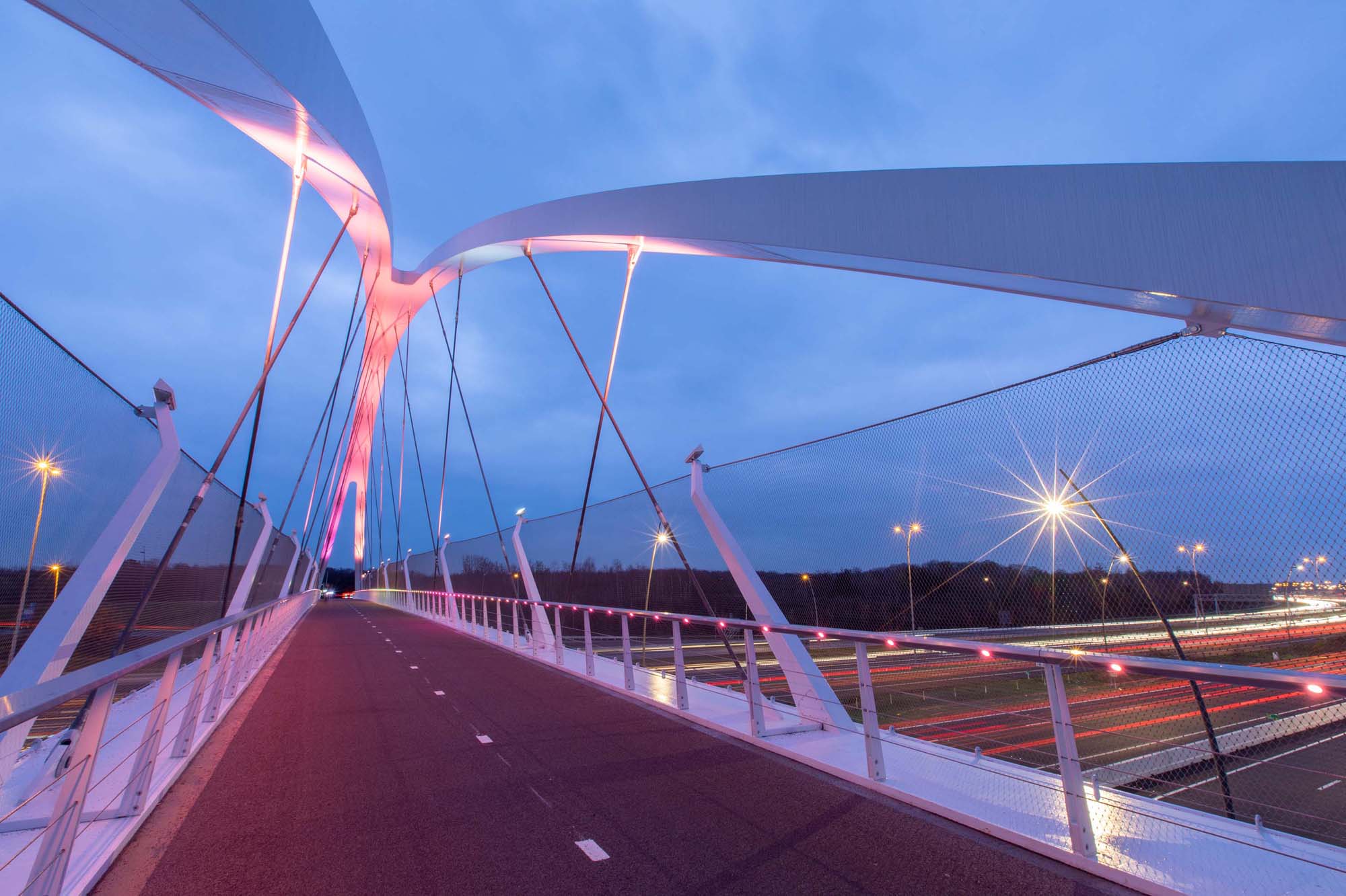 Parametrisch ontworpen, superslank en mooi aangelicht, dat is fietsbrug Tegenbosch over de A2 nabij Eindhoven Airport. De 160 m lange stalen brug vormt een belangrijke aanvulling op het fietsroutenetwerk. Dankzij de keuze voor een netwerkboog is de brug constructief zeer efficiënt en bijzonder transparant.